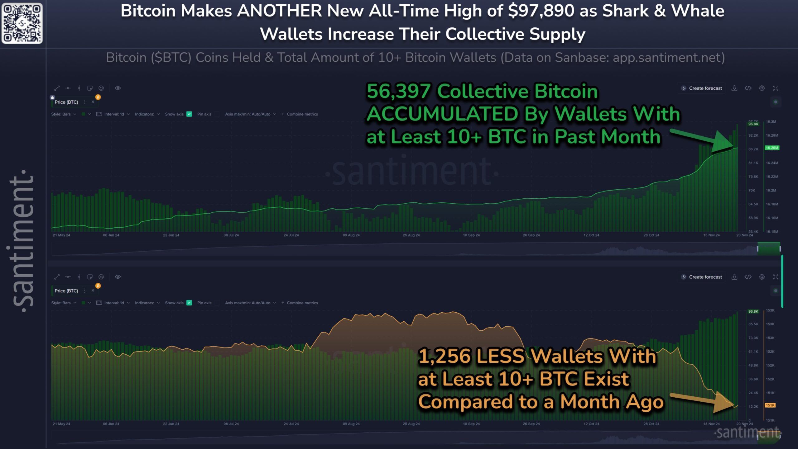 Whale addresses have been steadily accumulating Bitcoin over the past month, adding 56,397 BTC worth approximately $5.42 billion. This consistent buying pressure has significantly supported Bitcoin’s price action, driving it to new highs. Whale activity is considered a bullish indicator, as these large investors often influence market trends.