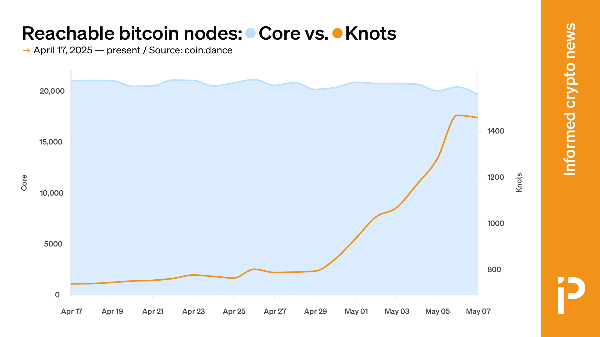 Knots’ default mempool will not lift the datacarrier limit of OP_RETURN, no matter what Core decides. Therefore, the growth of reachable Knots nodes — which reached an all-time high of 6.5% yesterday, according to tracker Coin.dance — is a proxy for measuring the resistance movement.