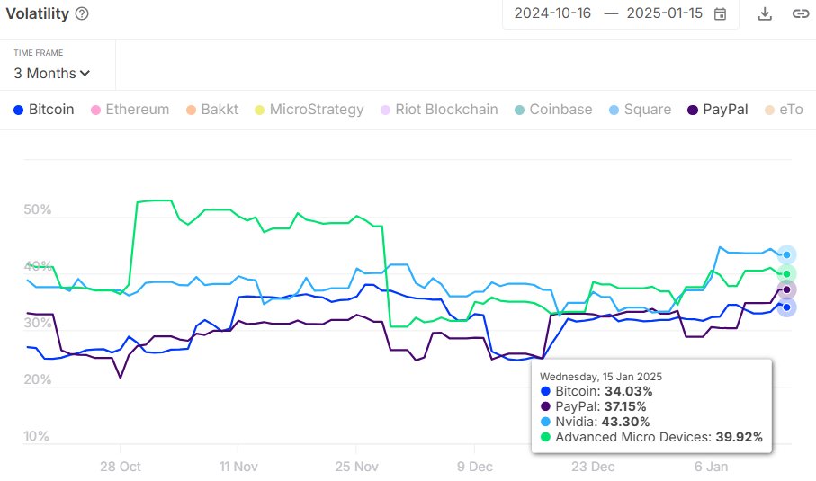 In an X post on Wednesday, January 15, IntoTheBlock shared data showing that Bitcoin’s price has been less volatile over the past three months than the stock prices of tech giants like PayPal, Nvidia, and AMD. Specifically, Bitcoin had 34.03% volatility within the period, while PayPal, Nvidia, and AMD had a volatility of 37.15%, 43.30%, and 39.92%, respectively.
