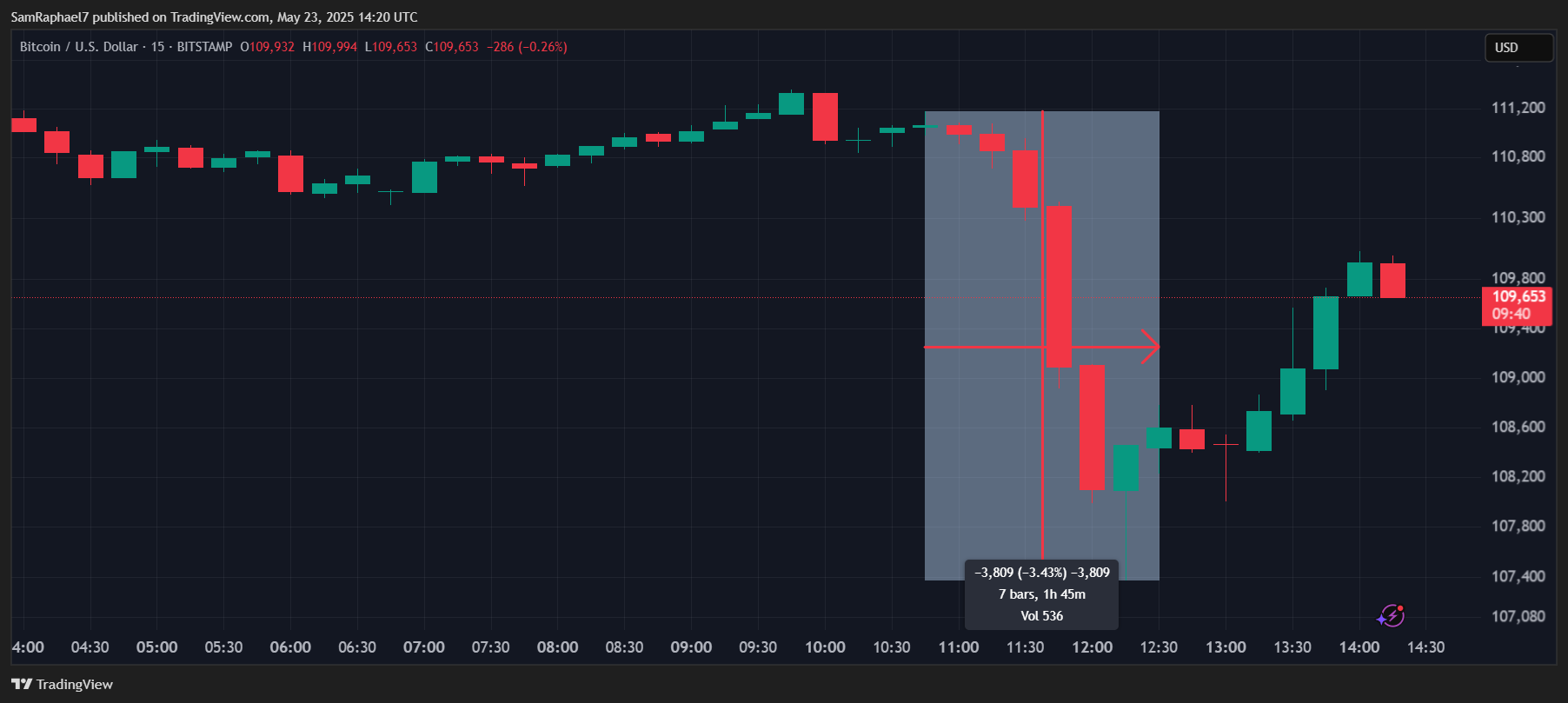 In response, Bitcoin dropped drastically after recently hitting a new all-time high close to $112,000. Notably, from a peak of $111,176 earlier today, the crypto firstborn collapsed to an intraday low of $107,367, marking a sharp 3.43% drop in under two hours. This represented one of Bitcoin’s sharpest slumps in recent times.