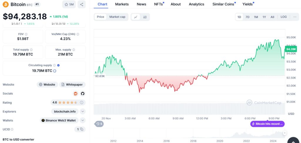 This achievement follows an impressive price rally that saw BTC climb to $94,309.46, marking its second ATH within a single week.