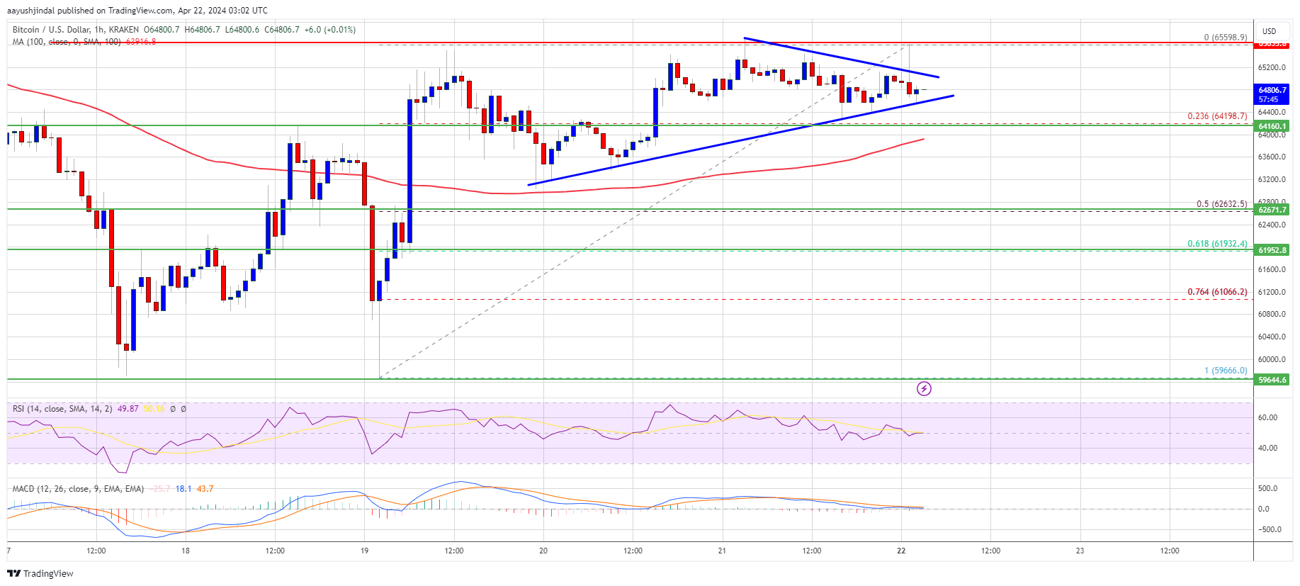 However, the bears seem to be active near the $65,500 zone. The recent high was formed at $65,598 and the price is now consolidating gains. There was a drop below the $65,000 level, but the price is still above the 23.6% Fib retracement level of the upward move from the $59,666 swing low to the $65,598 low.
