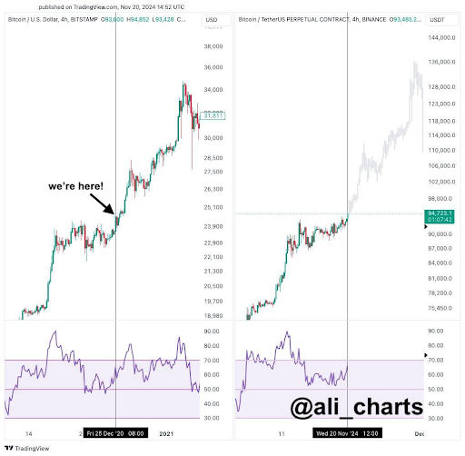 Crypto analyst Ali Martinez has provided insights into what could happen next after the BTC price hits the $100,000 milestone. In an X post, the analyst said that Bitcoin’s price action looks like it did in December 2020. He added that the Relative Strength Index is also nearly identical to the one in December 2020.