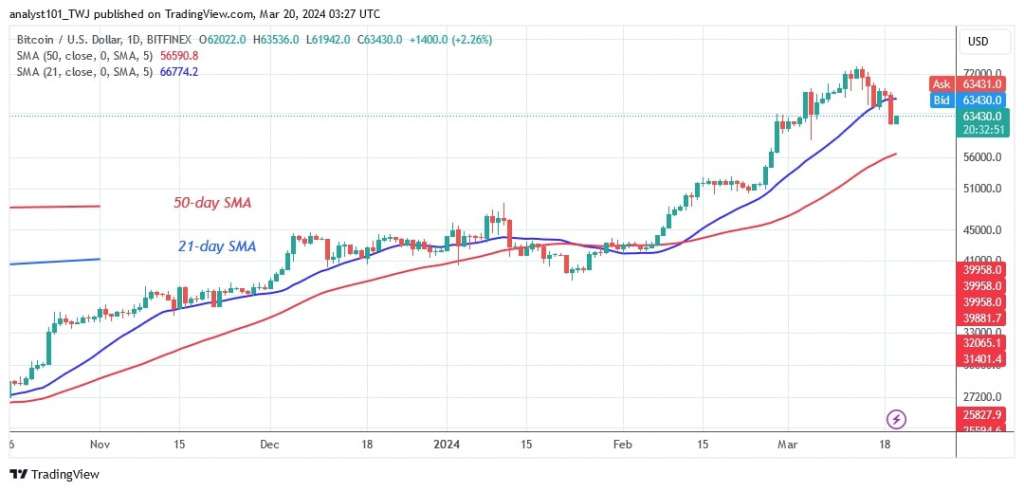 The cryptocurrency traded and reached a high of $73,794 before being beaten back. The rise ended when the price of the cryptocurrency fell below the 21-day SMA. Currently, the Bitcoin price is trading between the moving average lines. The value of Bitcoin is currently at $62,261 at the time of writing this article. According to the price indicator, Bitcoin is expected to fall even further.