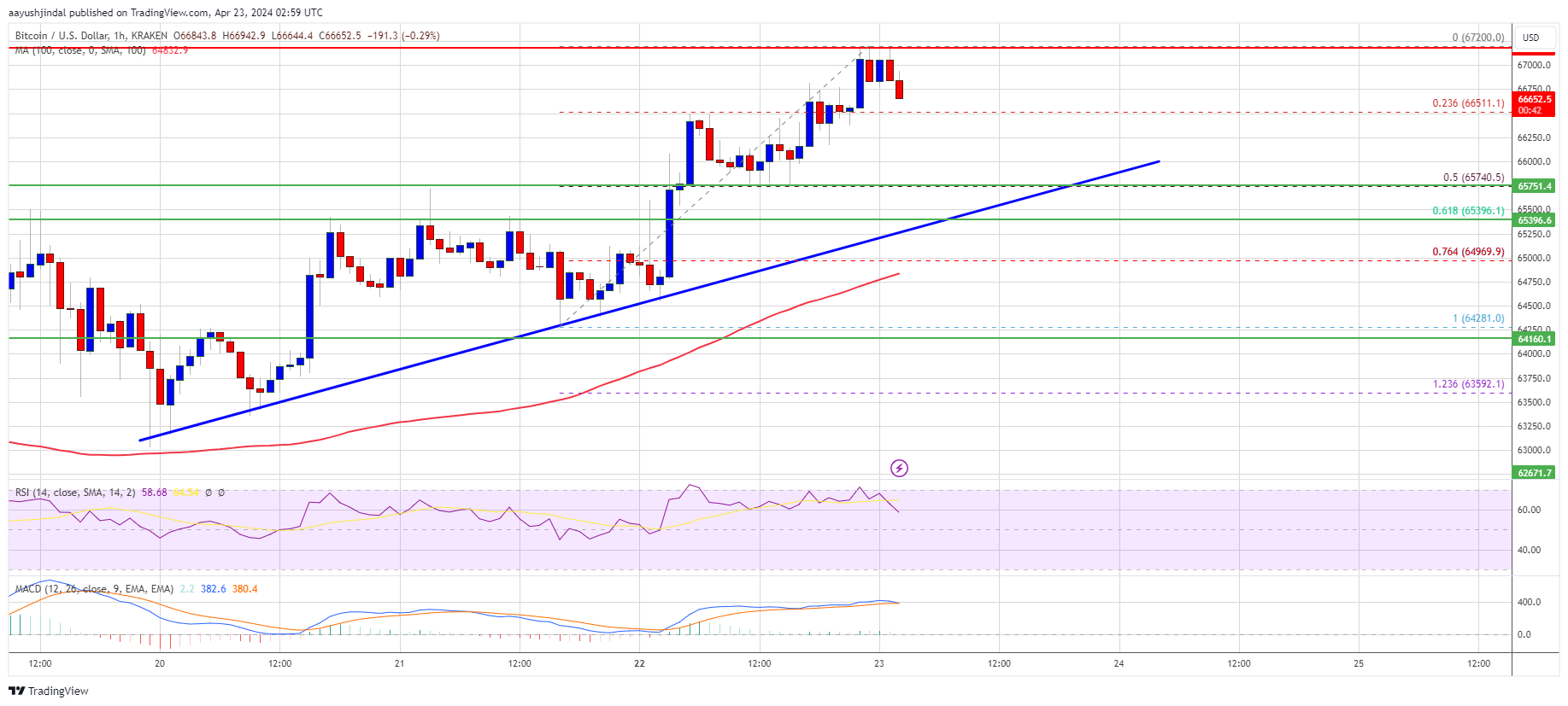 Bitcoin price started a fresh increase above the $64,500 and $65,000 resistance levels. BTC bulls even pushed the price above the $66,000 resistance. It traded to a new weekly high at $67,200 and is currently consolidating gains.