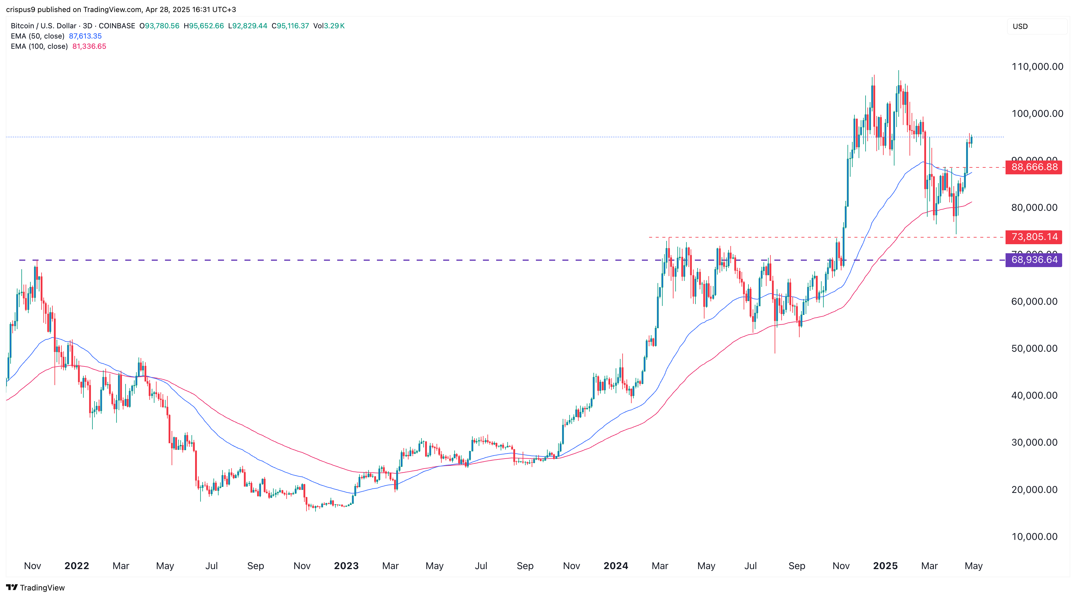 The 3-day chart shows that the BTC price has bounced back over the past few days. It recently crossed the crucial resistance level at $88,666, the neckline of the double-bottom pattern that formed earlier this month.