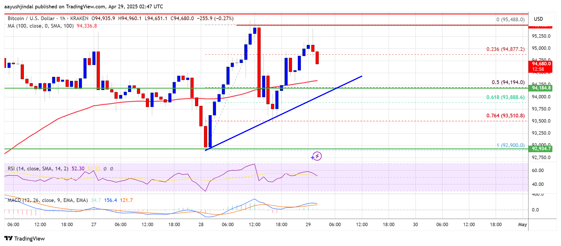 The bulls were able to pump the price above the $95,200 resistance. The recent high was formed at $95,488 and the price started a downside correction. There was a drop below the $94,500 and $94,200 levels. The price dipped below the 50% Fib retracement level of the upward move from the $92,900 swing low to the $95,488 high.