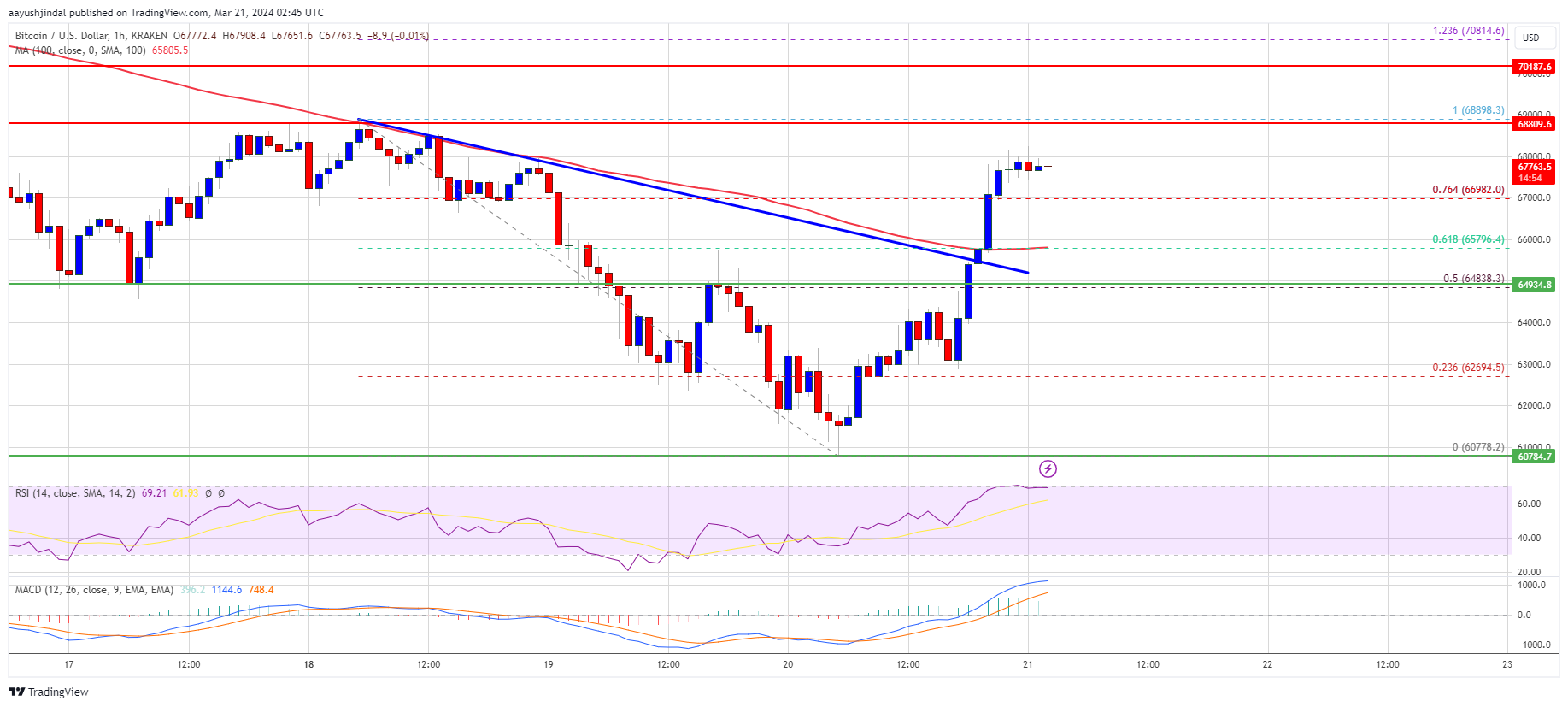 Bitcoin price started a strong recovery wave from the $60,800 zone. BTC is up nearly 10% and now facing hurdles near the $68,800 resistance.