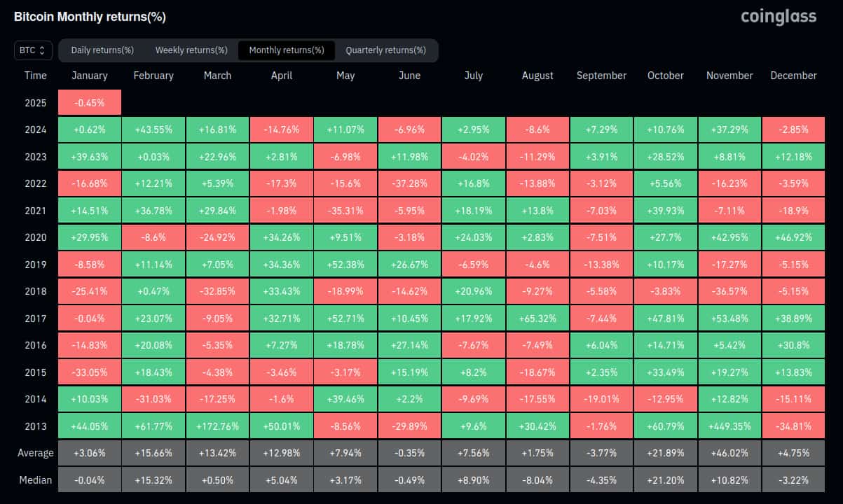 As January develops, Finbold again retrieved data from Coinglass, calculating Bitcoin’s average and median historical returns for each month.
