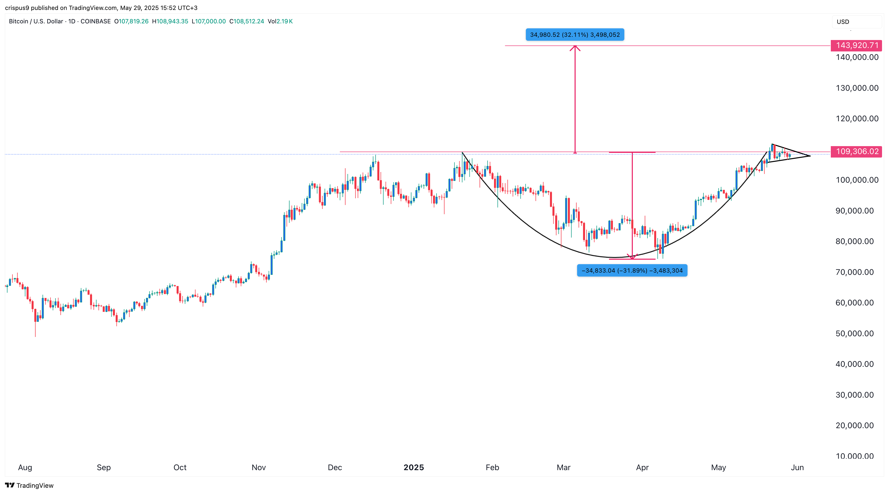 The cup has a depth of approximately 32%, which suggests a price target of $143,920 when projected from the pattern’s upper boundary.
