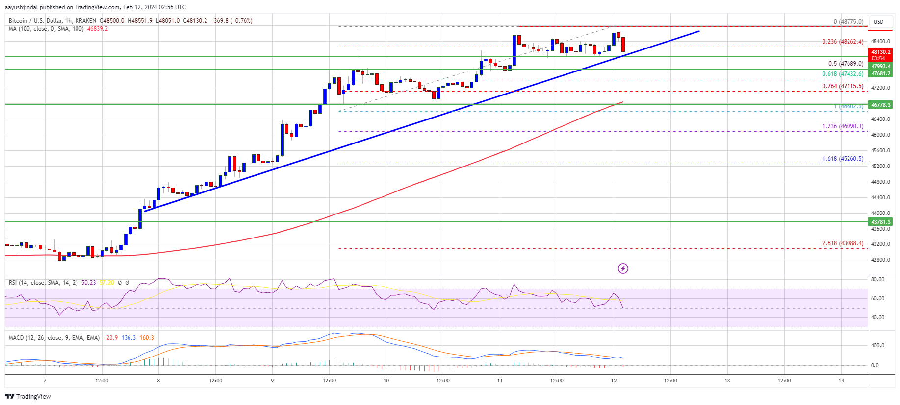 If Bitcoin fails to rise above the $48,800 resistance zone, it could start a downside correction. Immediate support on the downside is near the $48,000 level or the trend line.