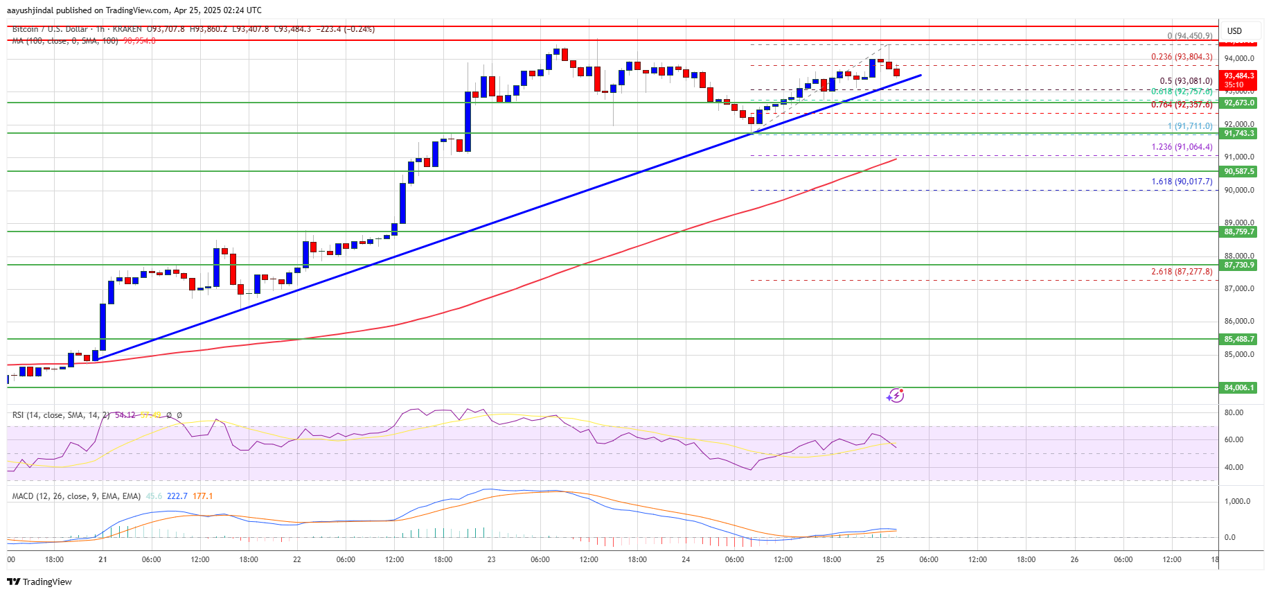 The bulls were able to pump the price above the $93,500 resistance. It even climbed higher and retested the $94,500 resistance zone. The recent high was formed at $94,450 and the price started a consolidation phase. There was a minor decline below the 23.6% Fib retracement level of the upward move from the $91,711 swing low to the $94,450 high.