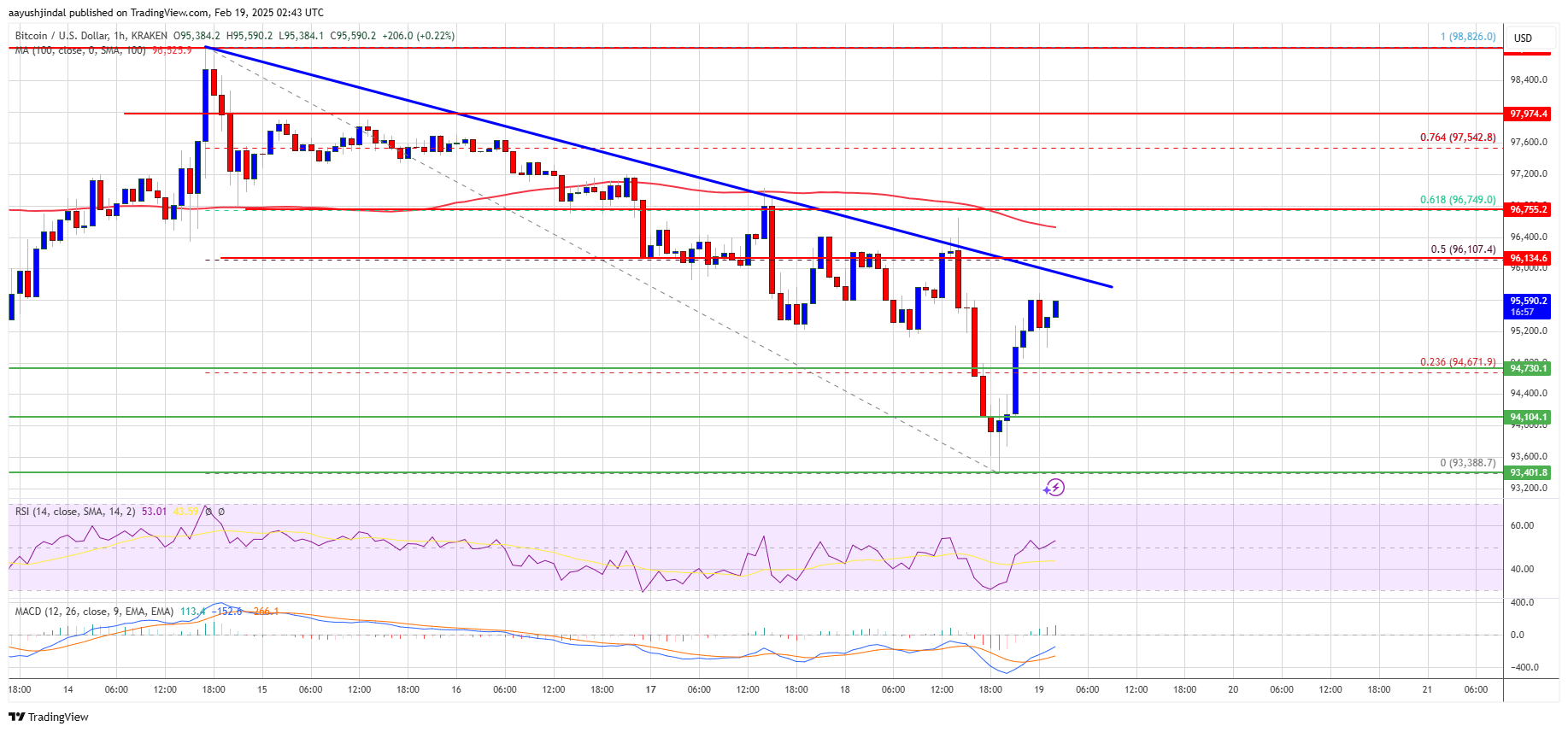 The price even dipped below the $95,000 level. However, the bulls appeared near $93,400. A low was formed at $93,388 and the price is now attempting to recover. There was a move above the $95,000 level. The price cleared the 23.6% Fib retracement level of the downward move from the $98,825 swing high to the $93,288 low.