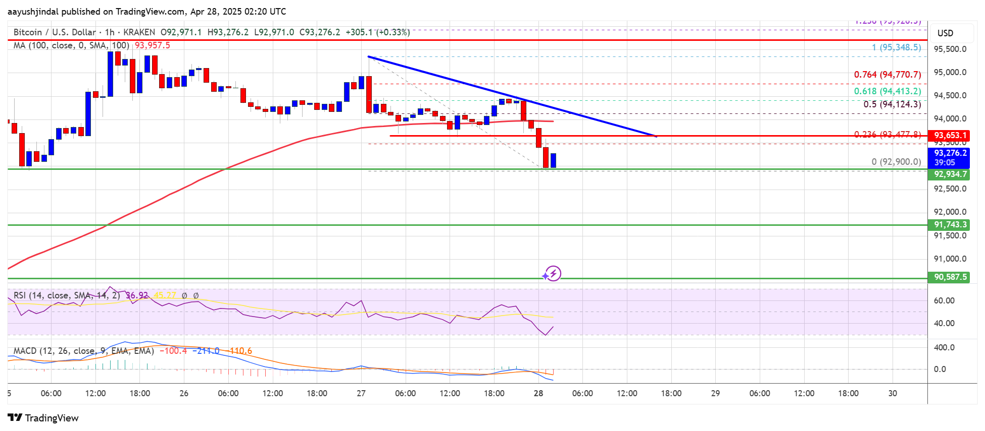 The bulls were able to pump the price above the $94,500 resistance. The recent high was formed at $95,348 and the price started a downside correction. There was a drop below the $94,500 and $94,000 levels. A low was formed at $92,900 and the price is now consolidating losses below the 23.6% Fib retracement level of the downward move from the $95,348 swing high to the $92,900 low.