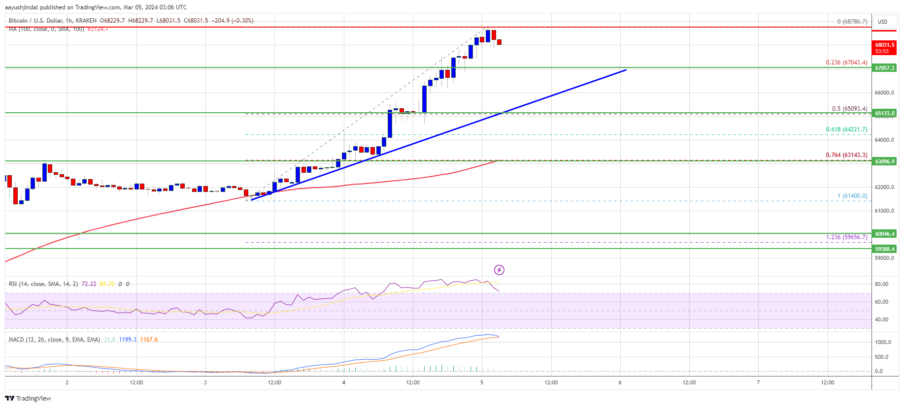 The price is up over 8% and it traded close to the last all-time high. A high is formed at $68,786 and the price is now consolidating gains above the 23.6% Fib retracement level of the upward move from the $61,400 swing low to the $68,786 high.