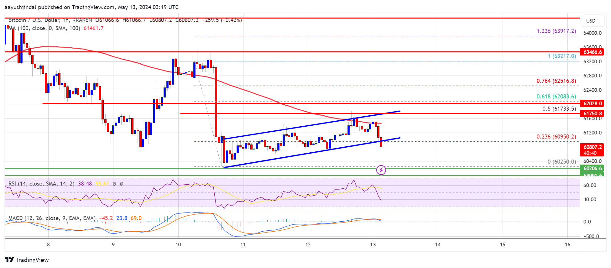 If Bitcoin fails to climb above the $61,200 resistance zone, it could continue to move down. Immediate support on the downside is near the $60,500 level.