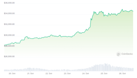 The current Bitcoin price, according to CoinGecko, stands at $34,750, with a 24-hour rise of 2.0% and an impressive seven-day rally of 23.2%.