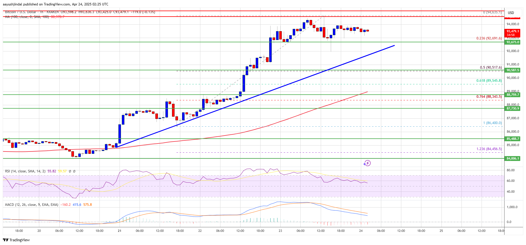 The bulls were able to pump the price above the $92,500 resistance. It even spiked and tested the $94,650 resistance zone. A high was formed near $94,635 and the price recently consolidated gains. There was a minor decline below the 23.6% Fib retracement level of the upward move from the $86,400 swing low to the $94,635 high.