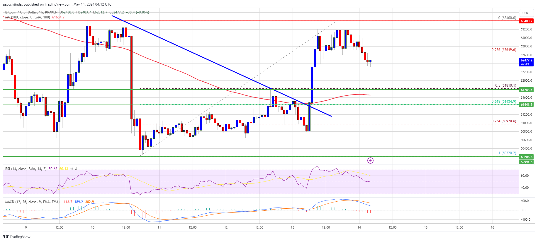 There was a move above the $61,000 and $61,200 levels. Besides, there was a break above a major bearish trend line with resistance at $61,400 on the hourly chart of the BTC/USD pair. The pair rallied and revisited the main hurdle at $63,500.