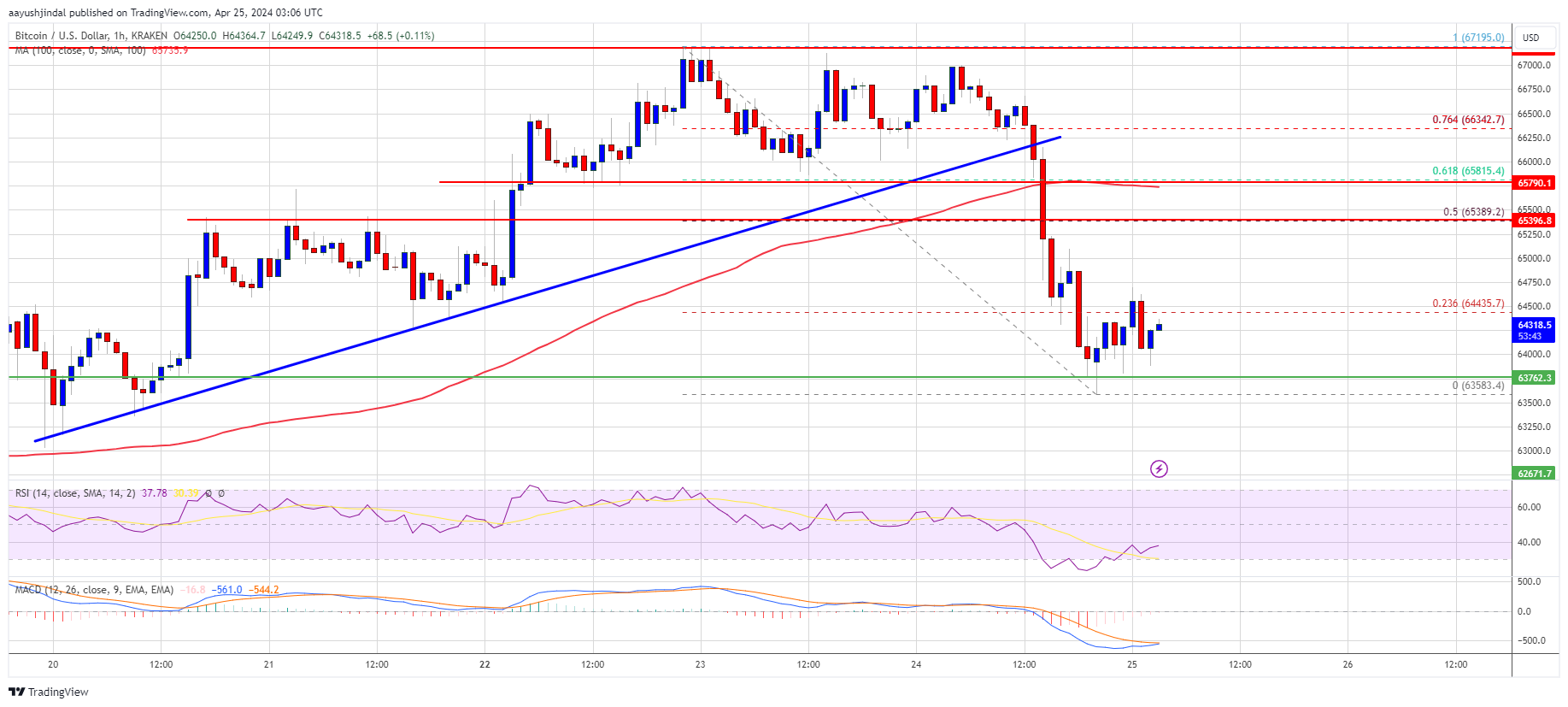 There was a move below the $65,500 support. Besides, there was a break below a key bullish trend line with support at $66,200 on the hourly chart of the BTC/USD pair. The pair even spiked below $63,650. A low was formed at $63,583 and the price is now consolidating losses.