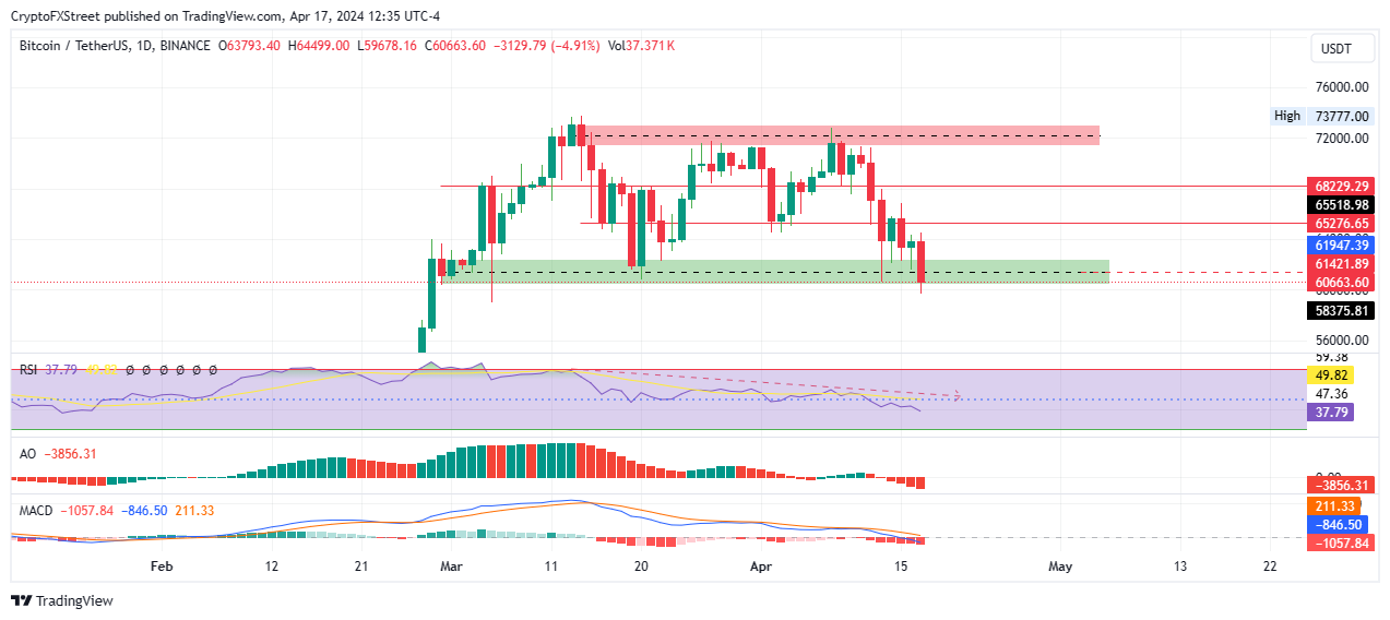 Bitcoin price is testing a crucial support, the demand zone between $60,364 and $62,412. The retests to this level are already one too many. The Relative Strength Index (RSI) teases with further downside and continues to slide lower to show momentum is falling.