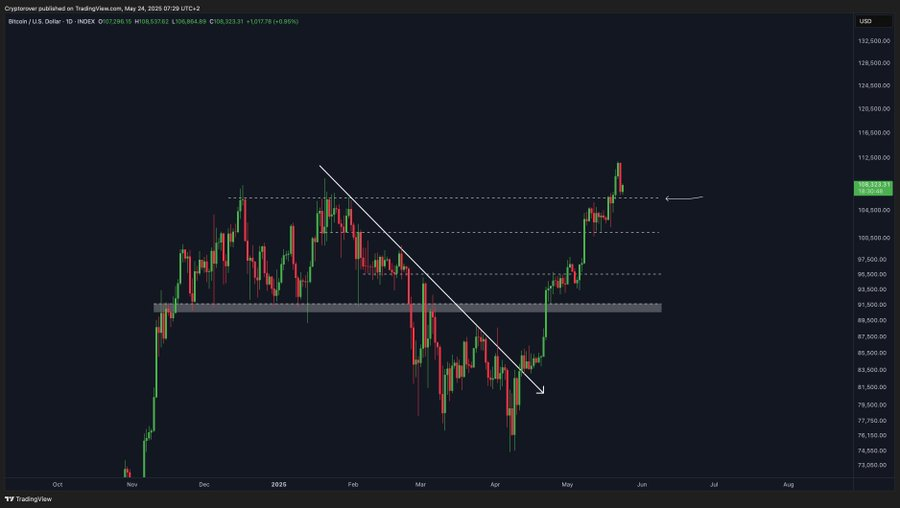 If Bitcoin successfully holds above the $106,500-$108,000 zone — which acted as previous resistance — it could confirm this area as new support. A successful retest here may fuel further upside momentum, keeping the bullish trend intact as the market heads into June.