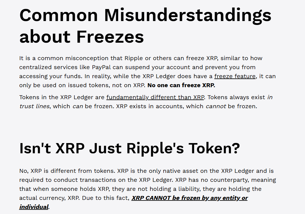 Specifically, it pointed out that while the XRP Ledger does have a freeze feature, it applies only to issued tokens, not XRP itself, and no one can freeze XRP. References to XRPL documentation backed this clarification.