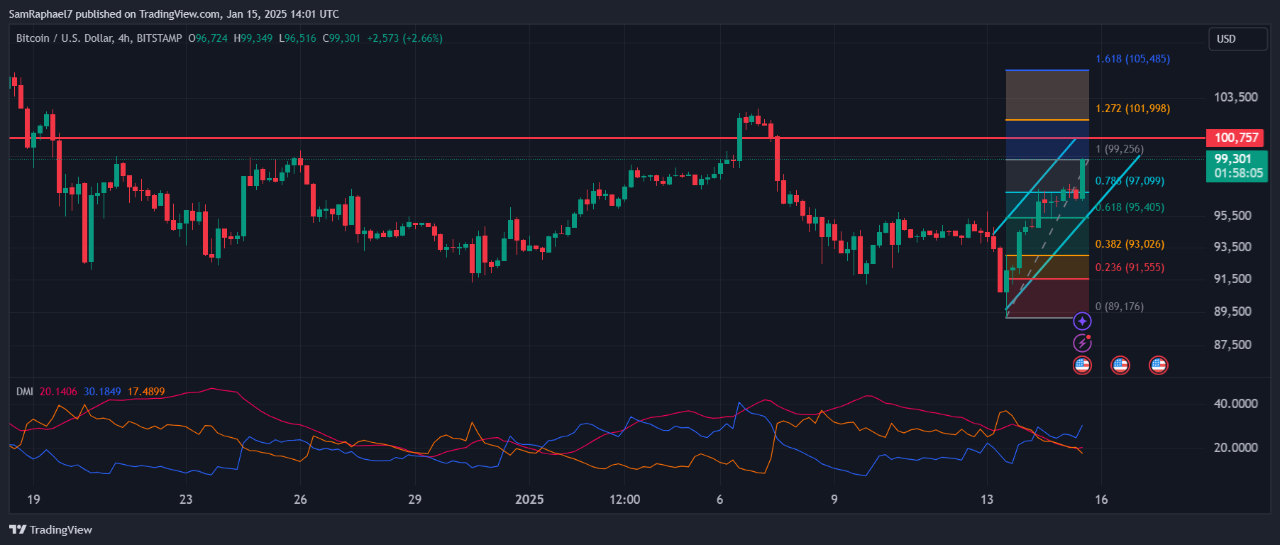Meanwhile, Fibonacci retracement levels show that the 0.618 mark at $95,405 served as strong support earlier. However, the 0.786 level at $97,099 was an intermediate barrier before Bitcoin surpassed $99,000 while the 1.272 extension at $101,998 and 1.618 extension at $105,485 are potential upside targets.
