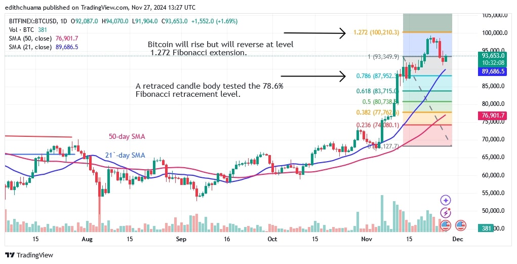 Coinidol.com reported on November 22, the Bitcoin price reached a high of $99,800 before falling back.