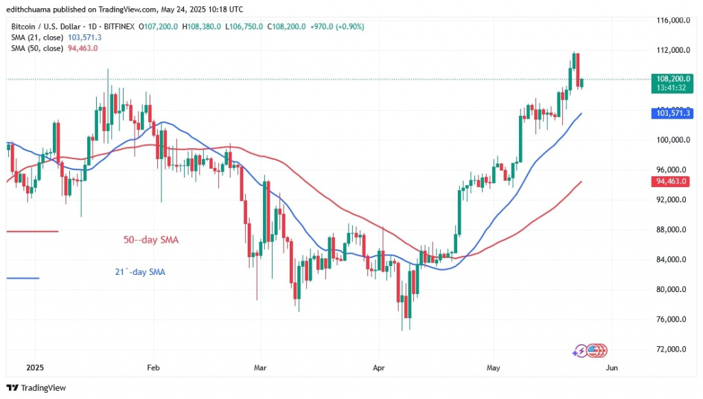 However, if Bitcoin falls from the current high, it will settle between the resistance at $112,000 and the 21-day SMA support. On the downside, Bitcoin’s uptrend will be undermined if the bears break the 21-day SMA. Bitcoin will fall above the 50-day SMA support or the $94,476 low.