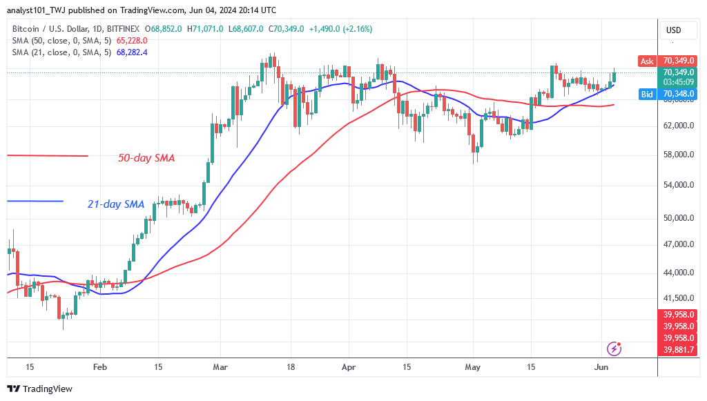 Bitcoin rose sharply on June 3, reaching the psychological price level of $70,000. Prior to this, the Bitcoin price moved in a range of $66,400 to $70,000. On May 31, the bears pushed Bitcoin to a low of $66,800 and attempted to break the 21-day SMA support. Bitcoin recovered and reached its previous high of $71,071. The cryptocurrency is currently worth $70,378.