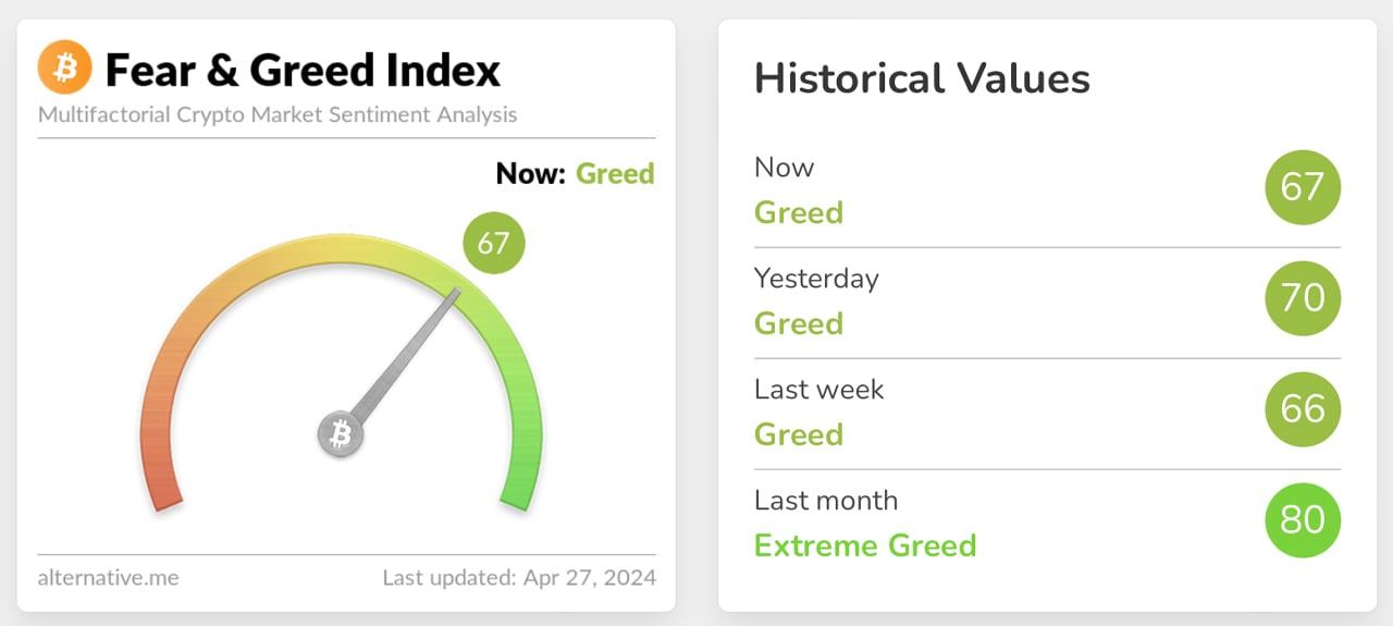 Over the past week, bitcoin has exhibited a downward trend, with its price stabilizing at around $62,950 to $63,125 per unit as of April 27. Despite this dip, the Crypto Fear and Greed Index remains firmly in the “greed” sector. According to Google Trends, interest in the term “bitcoin” has diminished, while the market intelligence firm Santiment reports an uptick in BTC sell signals.