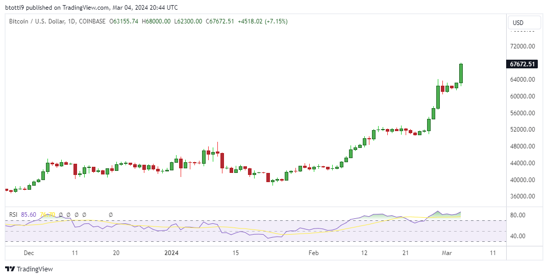 - Bitcoin price has touched highs of $68,000 on Coinbase.