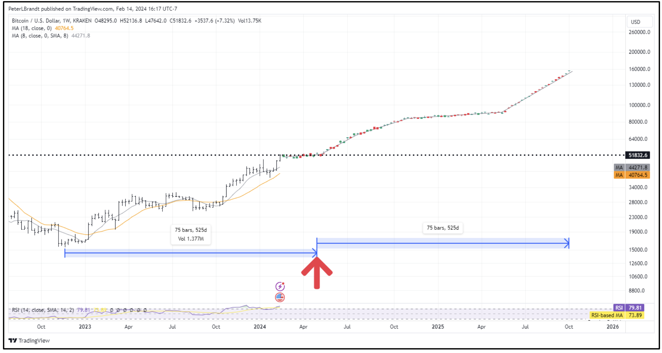 Brandt’s analysis, published in a document, delves into Bitcoin’s price patterns before and after its previous halvings. He suggests that, should the bull trend post-April 2024 mirror the pace observed since the November 2022 low, approaching the $150,000 milestone could be a likely scenario.