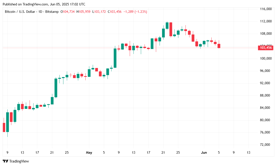 Stock markets jumped on the news, with the S&P 500, Nasdaq, and Dow all initially climbing 0.41%, 0.72%, and 0.26% respectively, according to CNBC, but those gains had disappeared at the time of reporting. Coinmarketcap data shows that bitcoin edged lower by 1.84% and is currently trading just below the $104K mark.