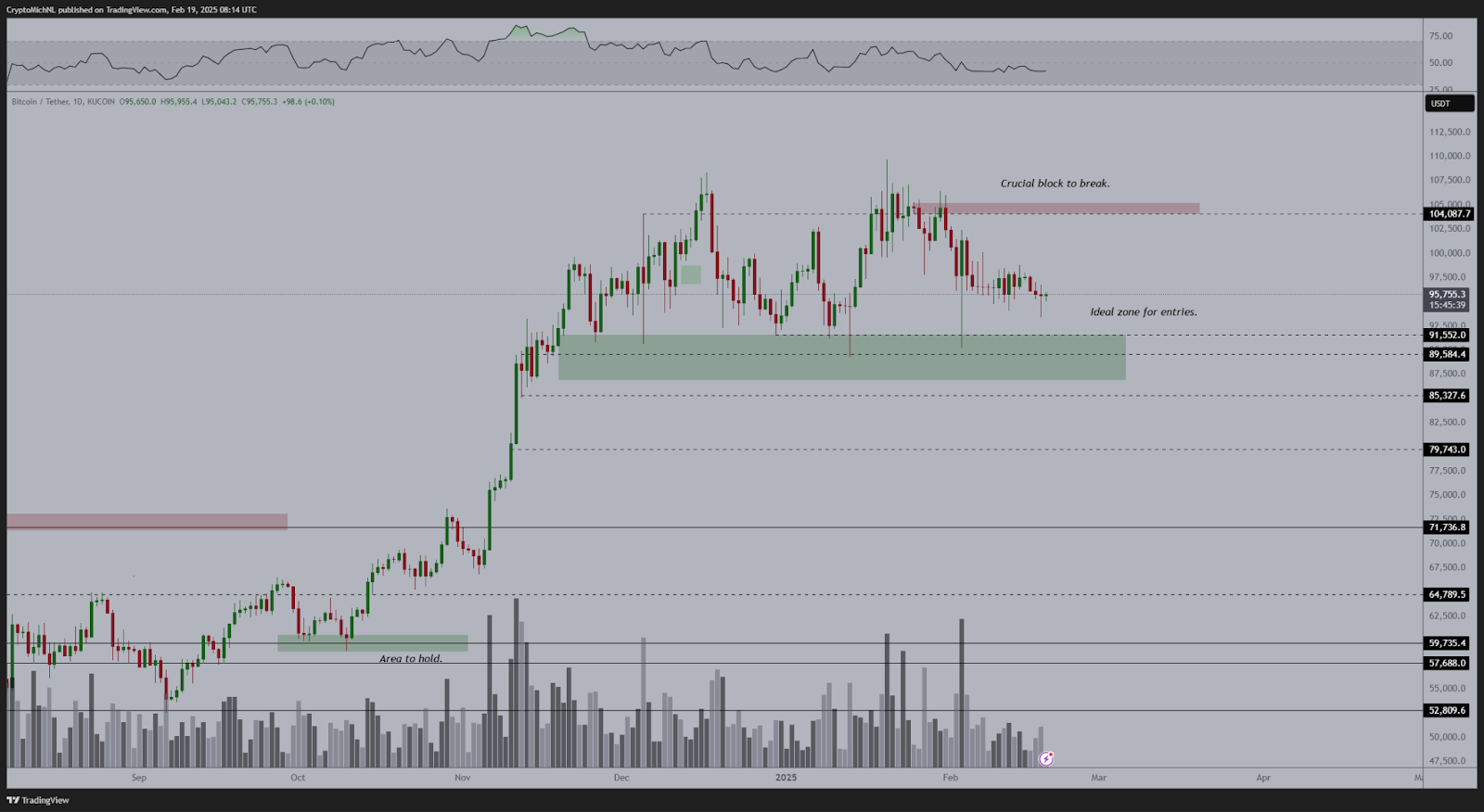 To illustrate, the analyst even shared a screenshot of Bitcoin’s daily chart to highlight these “ideal zones” for entry. These zones fall within Bitcoin’s established support region dating back to December 2024, specifically the price range between $87,000 and $91,500.
