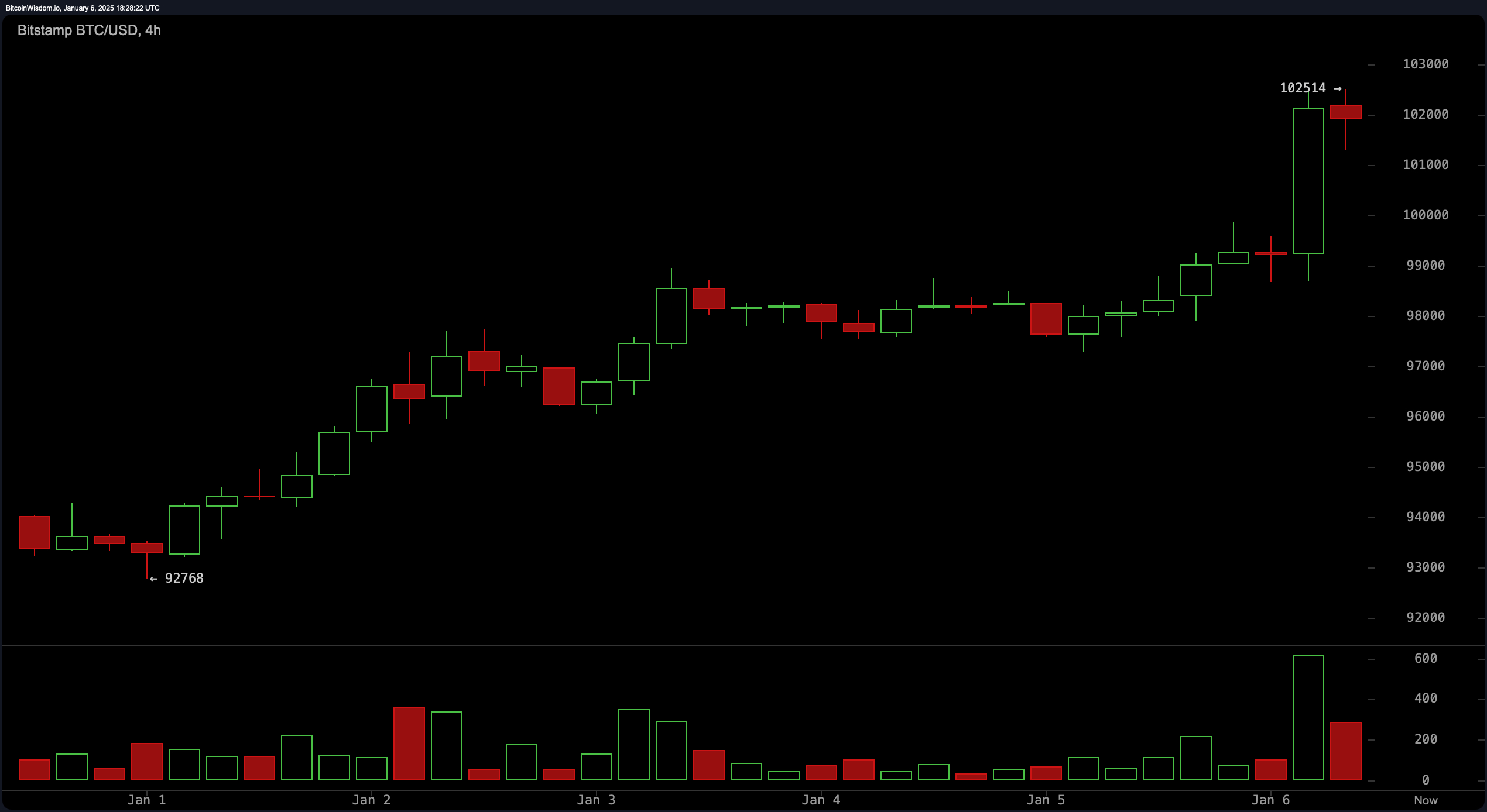 The volume spike during the breakout above $100,000 and $101,000 is quite a bullish indicator. However, the four-hour and one-hour charts also reflect minor overextension, suggesting a possible short-term pullback or consolidation before further upward movement. This took place after the intraday peak. Momentum-driven traders should watch closely for confirmations above $103,000 to ensure continued bullish strength.