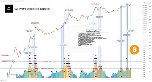 Da Prof’s technical indicator model synthesizes insights from thirteen time-tested on-chain and market metrics. This multifactor approach has successfully predicted past cycle tops in 2013, 2017, and 2021, making it a valuable tool in potentially identifying long-term market turning points.