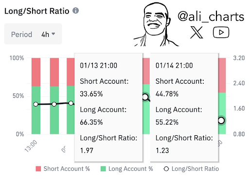 In an X post, crypto analyst Ali Martinez revealed that Bitcoin traders have turned bearish despite the price recovery above $97,000. The crypto analyst mentioned that the percentage of traders on Binance betting BTC will rise has declined from 66.35% to 55.22% over the past 24 hours.