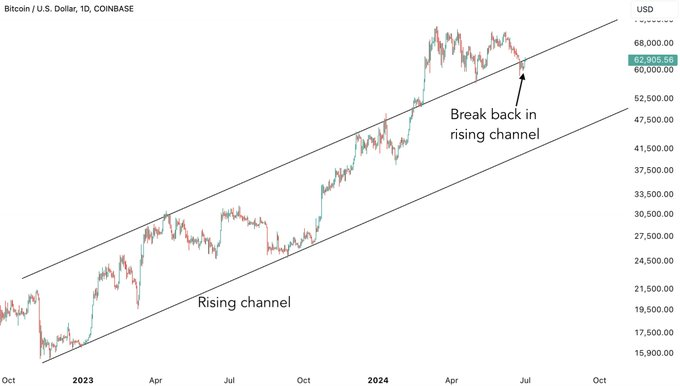 In particular, according to an analysis by investment research platform Game of Trades in an X post on July 2, Bitcoin has broken back into its rising channel around $62,000 after spending four months above it.