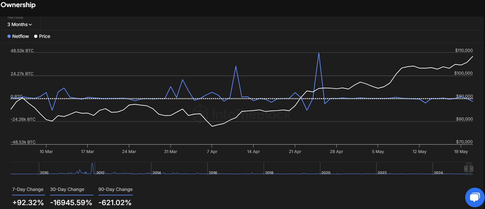 However, the 30-day and 90-day netflow figures present a contrasting picture. The 30-day change shows a sharp reversal in netflow, amounting to a decline of 16,945.59% compared to the previous period, likely reflecting a major outflow earlier in the month.