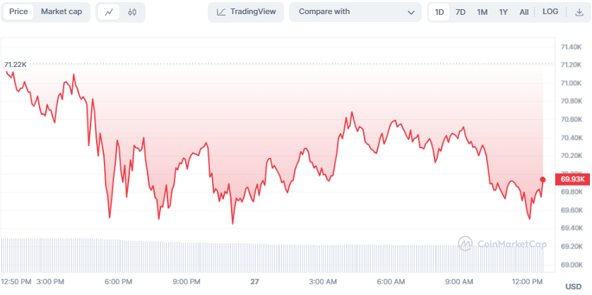 Despite this aggressive accumulation by whales, the price of Bitcoin has faced a downturn in the last 24 hours, falling below the $70K mark. According to CoinMarketCap, Bitcoin opened the day at $71.22K but dropped to an intraday low of $69.448K, eventually stabilizing at $69.77K. This represents a 1.39% decrease for the day, mirrored by a similar decline in its market capitalization to $1.369 trillion and a 23.13% fall in its intraday trading volume to $33.892 billion.