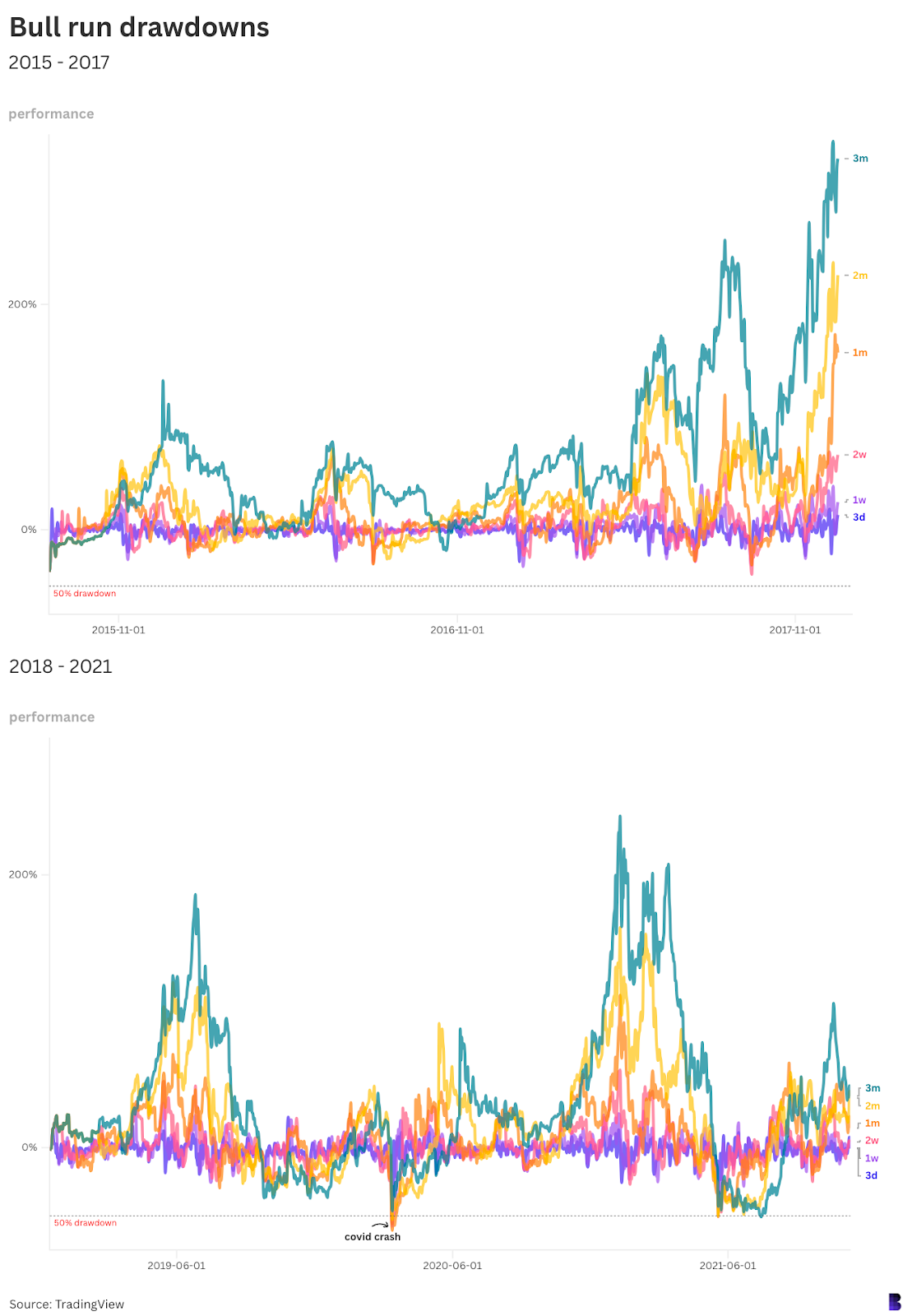 The dotted line at the bottom otherwise shows what a 50% drawdown would look like. As you can see, the bull run between August 2015 and December 2017 involved no drawdowns of that size.