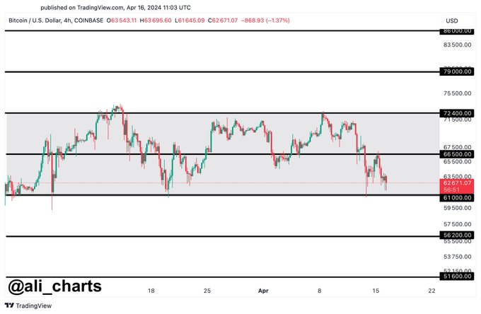 In line with this, crypto analyst Ali Martinez, in an X (formerly Twitter) post on April 16, pointed out that Bitcoin has established new support and resistance levels investors should watch.