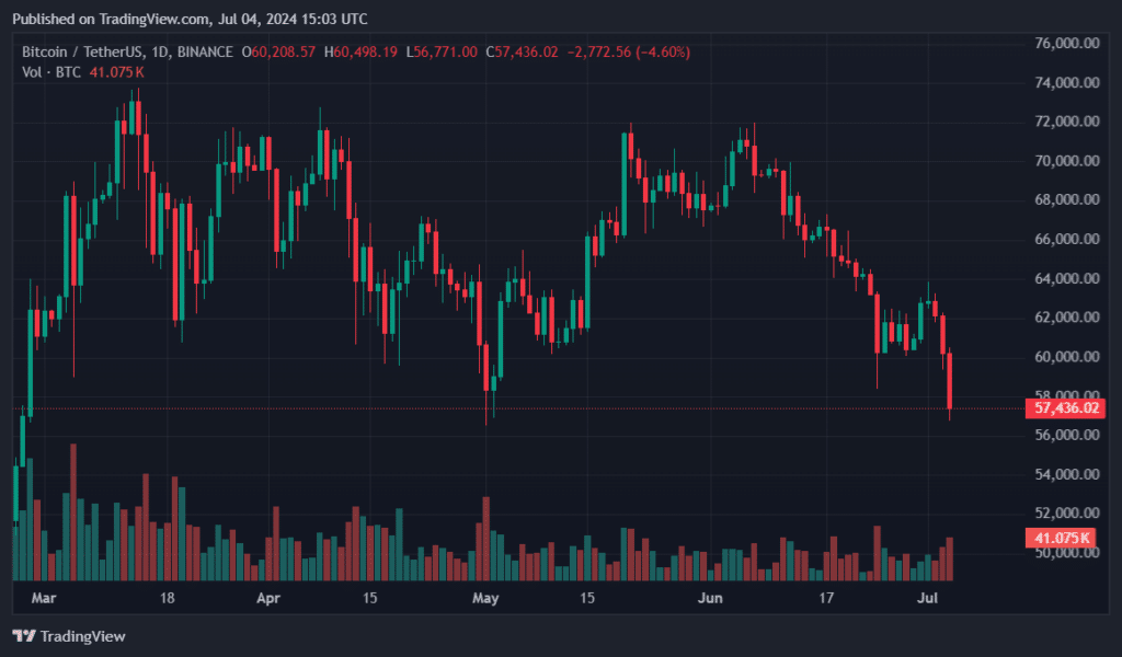 In a May exclusive interview with crypto.news, CryptoQuant head of research Julio Moreno noted that the market is “likely to see a miner capitulation if prices don’t recover significantly during the summer,” adding that the hashprice (average miner revenue per hash) is repeatedly “making new lows” following the latest halving. At the time of writing, Bitcoin is trading at $57,336, according to data from crypto.news.