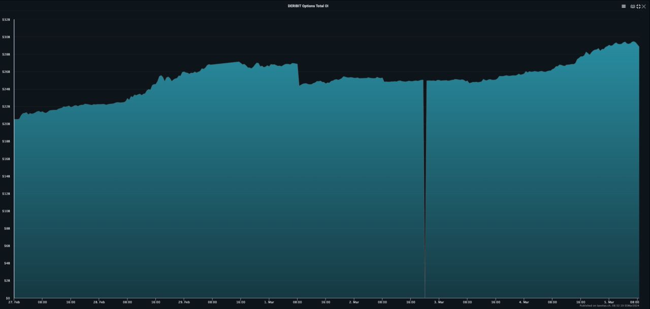 Deribit’s overall trading activity has surged alongside Bitcoin’s 58% increase this year, bringing it close to its all-time high of just above $69,000. The total notional open interest across crypto futures and options on Deribit has reached a new peak of $32 billion, with the options market contributing almost $30 billion to this figure.