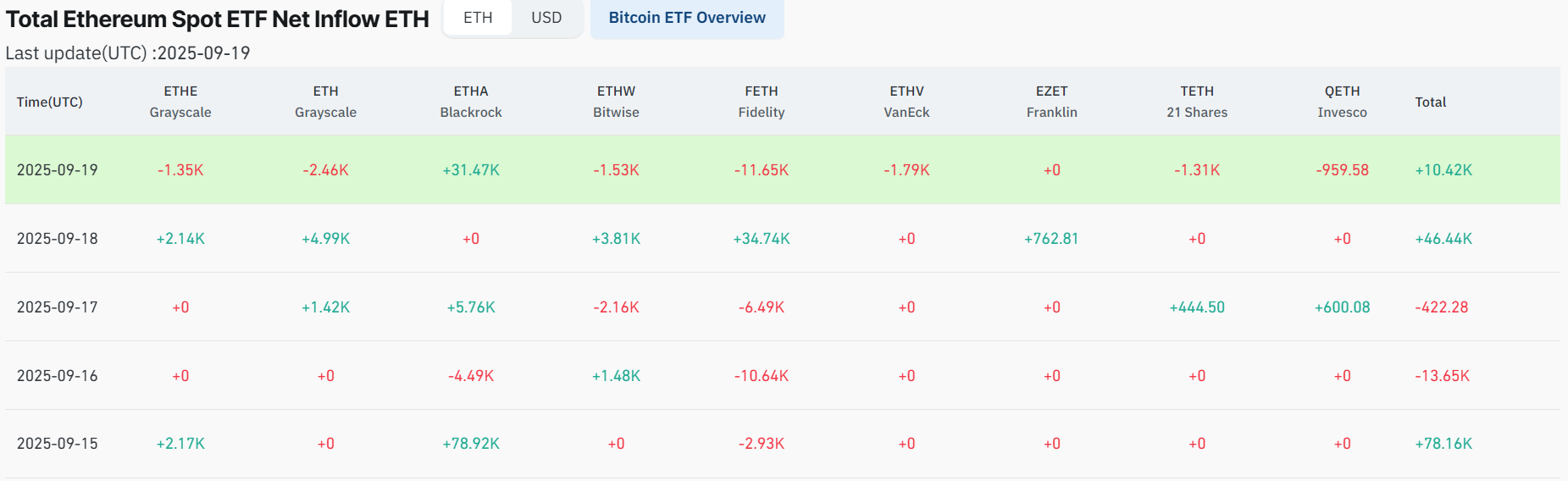 Overall, total net inflows into Ethereum spot ETFs reached $47.8 million on September 19, a modest rebound after midweek losses. The strongest day came on September 18, when combined products brought in more than $213 million, largely driven by Fidelity.