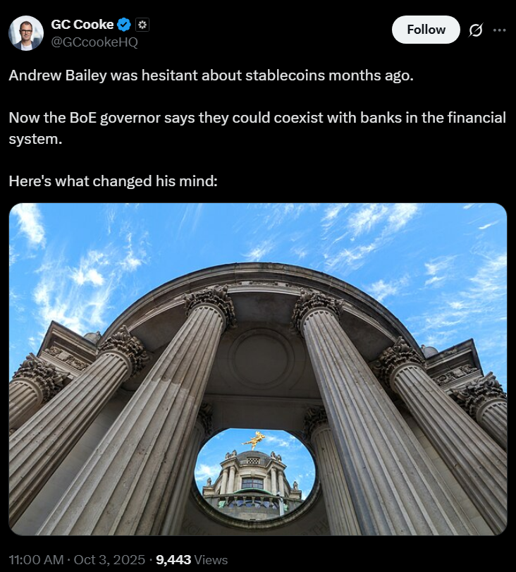 Citing people familiar with the discussions, Bloomberg reported that the BOE’s reconsideration comes amid intense industry backlash and growing international competition, particularly from the United States, which is moving toward clearer regulation through the GENIUS Act, which was signed into law in July.