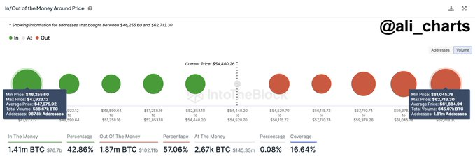 The data noted that while Bitcoin was trading around the $54,000 zone, addresses holding the asset between $44,256.50 and $51,841.18 represent approximately 42.86% of total addresses, holding 1.41 million BTC.