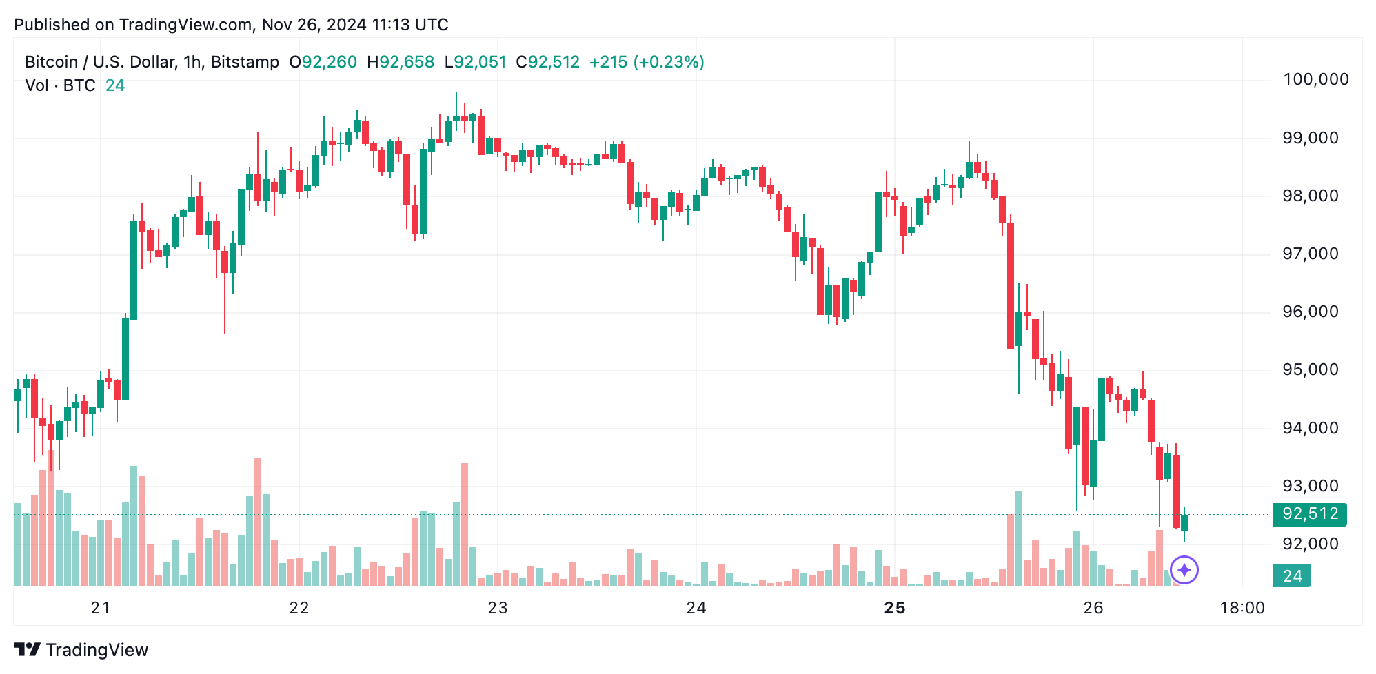 Bitcoin’s price movements on Nov. 26, 2024, paint a clear picture of bearish momentum in the short- and mid-term, with a pivotal support zone at $92,000 under close scrutiny.